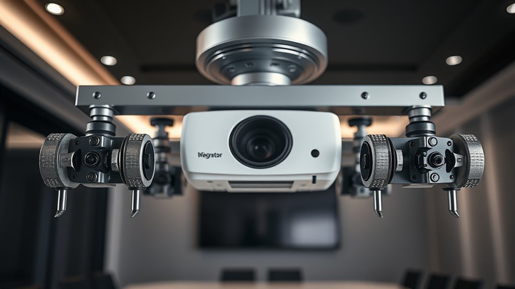 Safety features like heavy-duty locking mechanisms, adjustable tilts, and reinforced steel construction keep ceiling mounts secure. I always look for mounts with locking screws or pins that prevent accidental detachment. Vibration-resistant designs also help maintain stability. When I install a projector, I guarantee the mount is rated for weight and uses sturdy anchors. These features give me confidence that my setup stays safe and steady over time.