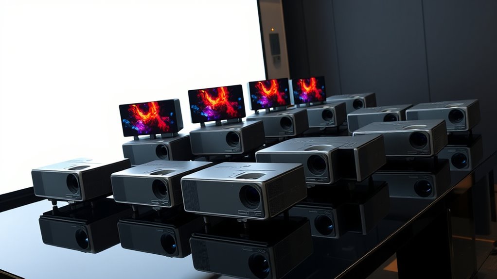 Ever wondered how ambient light impacts a high contrast 4K projector? It can considerably reduce image quality since bright room conditions wash out the stunning details and deep blacks these projectors deliver. To enjoy ideal visuals, I recommend controlling ambient light—using curtains, dimming lights, or choosing darker rooms. This way, you’ll get the true vibrant contrast and sharp clarity these projectors are designed to deliver, making your viewing experience truly exceptional.