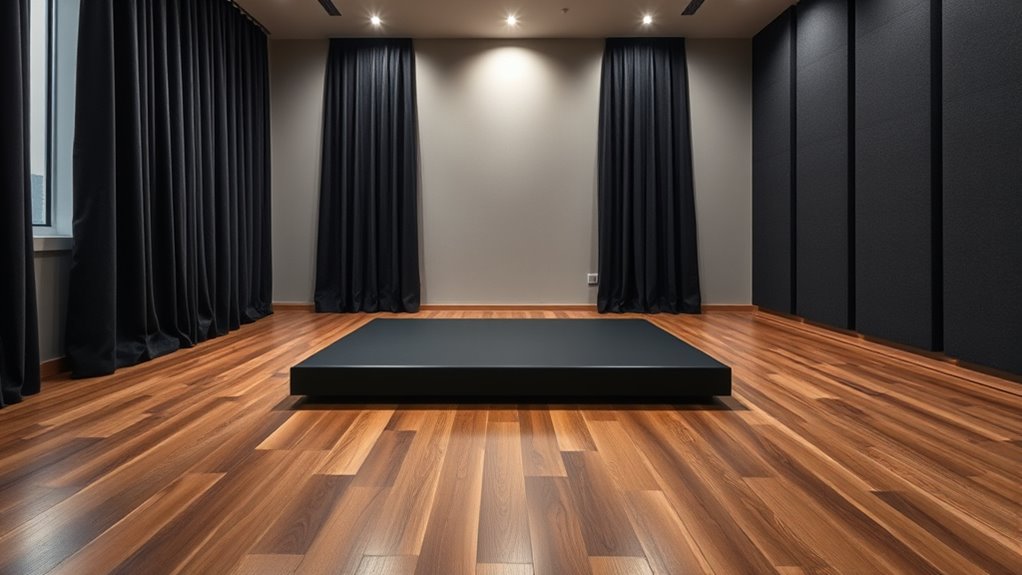 Choosing the right high-end acoustic isolation platform hinges considerably on the quality and durability of its materials. I look for platforms made from dense, rigid materials like MDF, engineered wood, or dense foam, which effectively dampen vibrations and minimize resonance. Durability is essential because it ensures the platform maintains its performance over time, resisting warping, cracking, or degradation. Premium composites often incorporate multi-layered designs with damping layers such as foam, rubber, or MDF, optimizing vibration absorption across frequencies. The materials also determine the platform’s weight capacity, stability, and ability to support heavy equipment without sacrificing sound isolation. Additionally, high-quality materials resist environmental factors like moisture and temperature changes, guaranteeing long-term performance and consistent sound clarity.