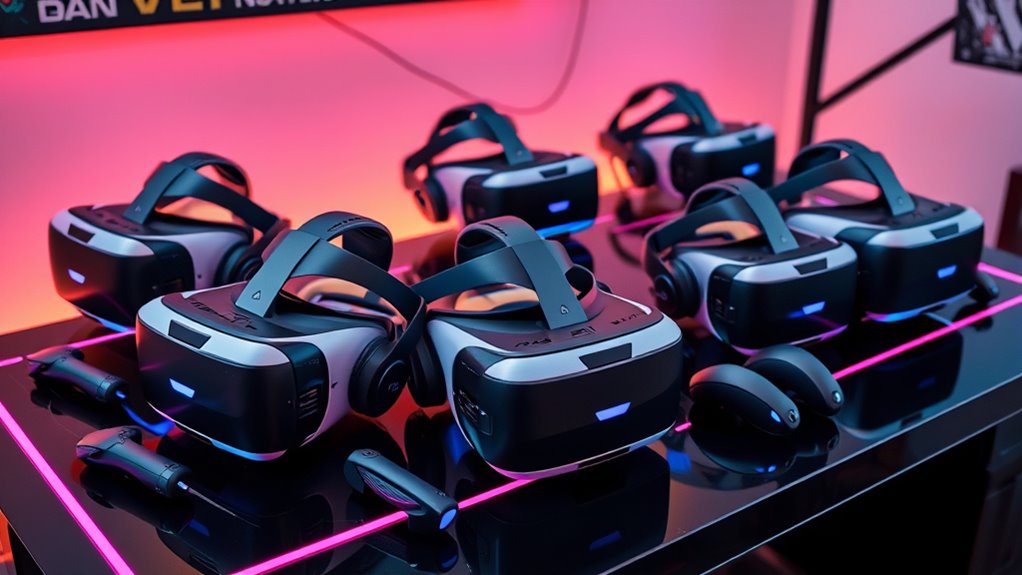 Maintaining my premium VR equipment requires regular cleaning, especially of lenses and sensors, to guarantee clear visuals and accurate tracking. I routinely check and update firmware to keep everything running smoothly. I also store my gear in a cool, dry place and handle it gently to prevent damage. Periodic software updates and avoiding excessive wear help prolong the lifespan of my VR systems and uphold peak performance.