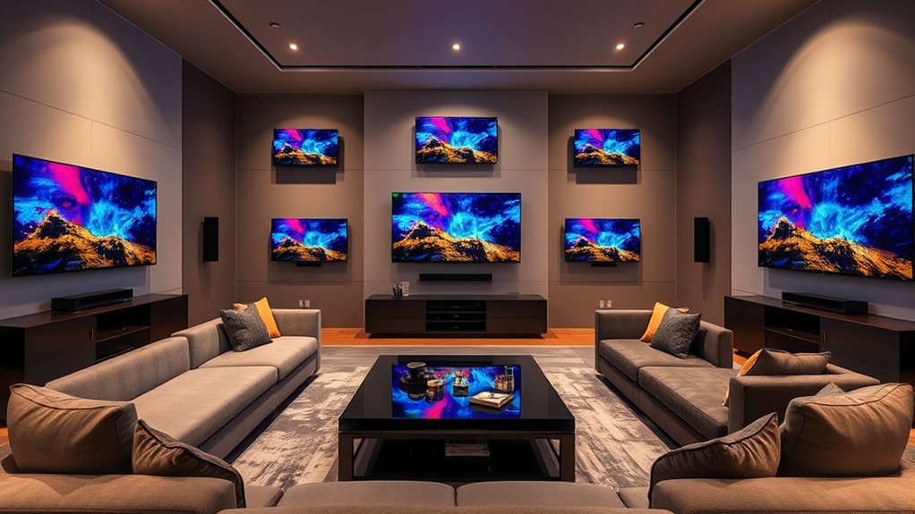 Experiencing exceptional sound is just one part of the equation when I’m looking at high-ticket 4K laser TVs; smart features play a significant role in enhancing my viewing experience. I always check for built-in smart TV platforms like Android TV or webOS to easily access my favorite streaming apps. Compatibility with voice assistants like Alexa or Google Assistant is vital for convenient voice control. I also look for Wi-Fi 6 or higher for fast, stable streaming. Multiple HDMI ports and Bluetooth connectivity are essential for connecting various devices. Lastly, features like automatic app updates and a user-friendly interface guarantee I can enjoy ongoing enhancements without hassle. These smart features truly elevate my overall viewing experience.