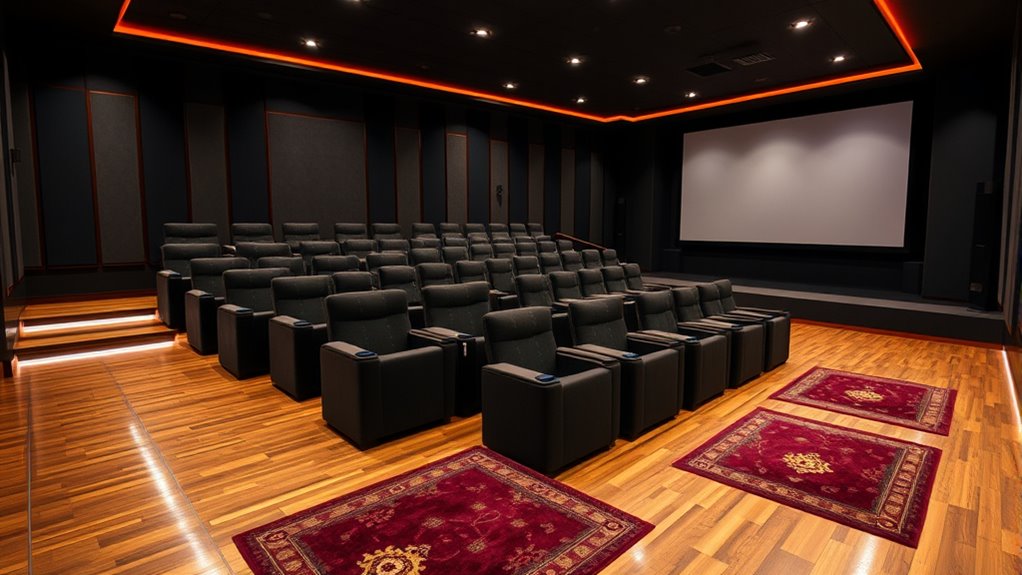 I always opt for carpeted flooring in my home theater to minimize glare and reflections. Imagine a room with plush, thick carpet that absorbs light rather than bouncing it around—it’s like creating a cozy cocoon that enhances picture quality. To choose the right flooring, look for matte finishes or textured surfaces, avoiding shiny or glossy materials. This simple switch markedly improves your viewing experience by reducing unwanted reflections.