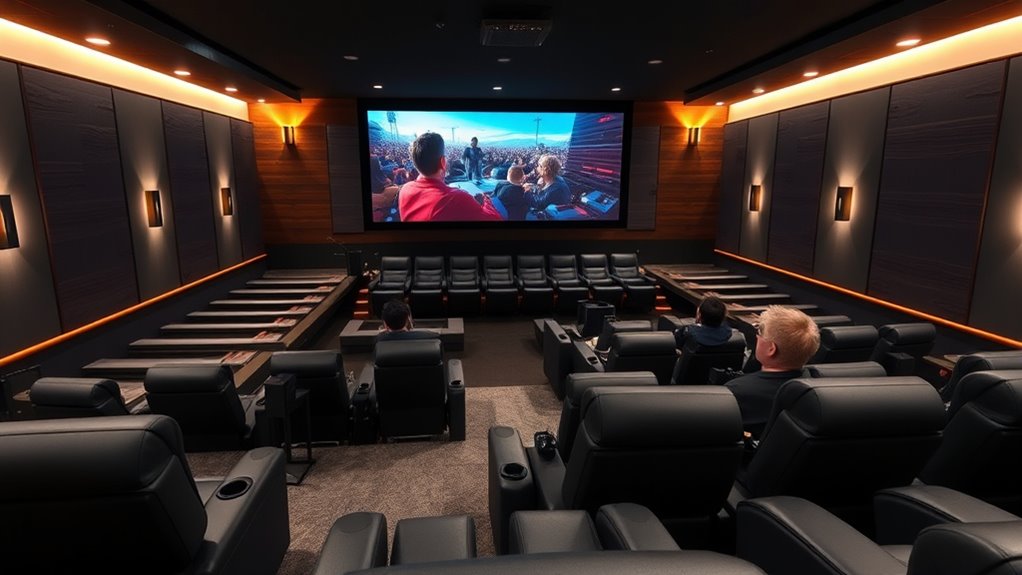 If you’re looking to boost your home theater experience, I recommend exploring the best risers designed for stability and heavy support. Options like heavy-duty furniture risers, speaker isolation pads, and adjustable platforms can elevate your seating, speakers, and equipment safely, even supporting thousands of pounds. Many models feature anti-slip elements, easy assembly, and sleek designs that blend with your decor. Keep going to discover top picks that can transform your movie nights with enhanced comfort and sound quality.