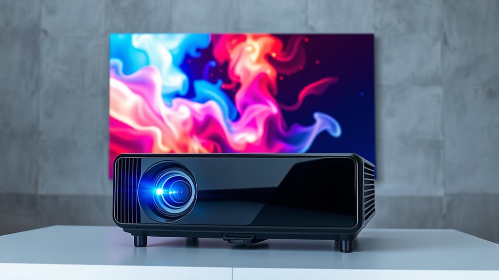 To guarantee your hybrid laser projector delivers true-to-life visuals, it’s important to pay attention to its color accuracy standards. I look for projectors with low ΔE values, which indicate more precise color reproduction. Supporting wide color gamuts like BT.2020 and DCI-P3 is essential for vibrant, realistic images. The ability to reproduce 100% of the RGB spectrum ensures colors stay accurate and vivid across various content. Calibration and factory color grading markedly influence how well a projector adheres to industry standards, so I prefer models that come pre-calibrated or offer easy calibration options. Additionally, support for HDR formats such as HDR10 and Dolby Vision boosts color fidelity and contrast, making images pop with richness and depth. Prioritizing these standards helps me achieve the most authentic viewing experience.