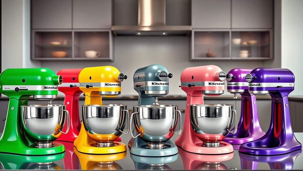 If you’re looking to add style and function to your kitchen in 2025, I recommend considering the top KitchenAid mixer colors. From sleek neutrals like white and black to vibrant shades like aqua blue and bold red, there’s a hue for every personality and decor. Whether you want a timeless look or a statement piece, choosing the right color can boost both your kitchen’s aesthetics and your baking experience. Keep exploring to find out which colors suit your style best.