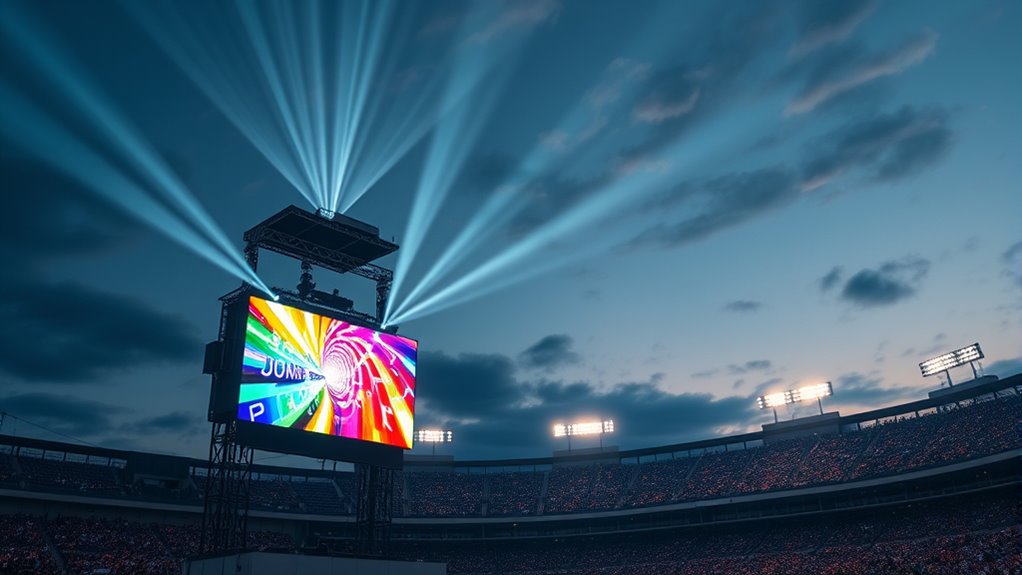 Portability and size are important factors to contemplate when opting for a large venue projector with 10,000 lumens or more. Many high-brightness models are designed with mobility in mind, weighing between 10 to 30 pounds to balance power and ease of transport. Compact models often feature handles or rugged cases, making setup and relocation simpler. Some projectors even include built-in batteries or quick-connect power options, enhancing their suitability for mobile use across different venues. The overall size, including dimensions and form factor, influences how easily the projector can be installed, stored, and transported during large-scale events. Considering these factors guarantees you can move and set up your projector efficiently, providing flexibility and convenience in dynamic event environments.
