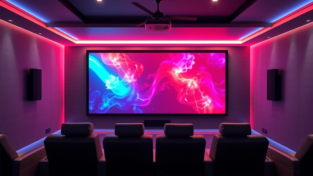 Choosing a laser phosphor 4K projector with excellent color accuracy and a wide color gamut can considerably enhance your viewing experience. A broader color gamut, like BT.2020 or DCI-P3, ensures more vibrant and realistic colors, making images pop and feel more lifelike. High color accuracy, indicated by a low ΔE value (below 3), means colors appear true to life, with minimal distortion. Better color reproduction delivers richer reds, greens, and blues, elevating overall image fidelity. Coverage of 100% of the REC 709 color space guarantees accurate reproduction of standard HD content, maintaining consistency. Support for full BT.2020 allows projectors to display an extensive spectrum of colors, essential for HDR and cinematic visuals. Prioritizing these factors guarantees stunning, true-to-life images in your home theater setup.