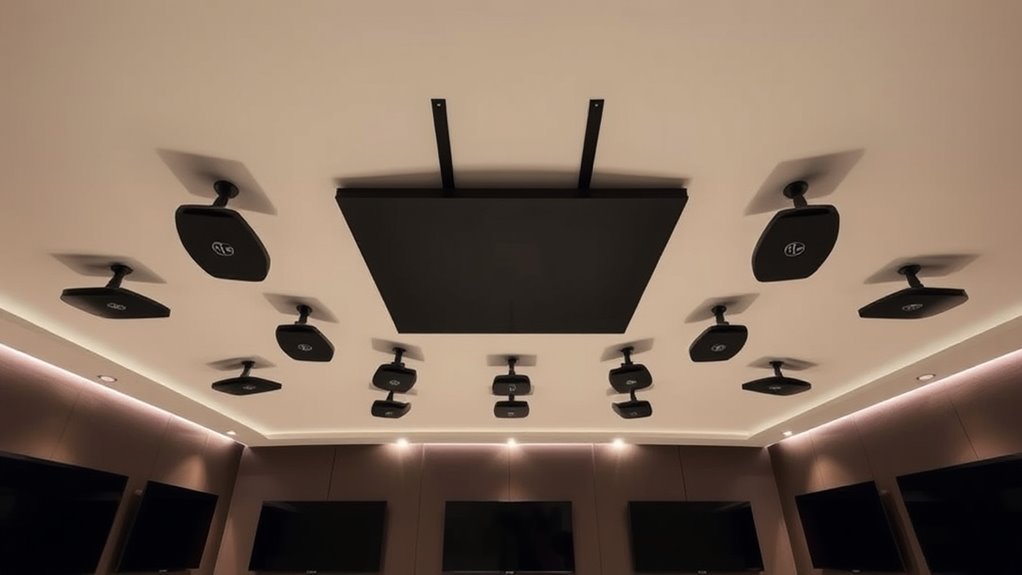 Looking for the best LG ceiling mounts for a flawless home theater? I recommend options that support large TVs up to 65 inches or projectors, with strong steel construction and versatile motion features like tilt, swivel, and height adjustment. Some mounts are motorized for easy remote control, ensuring a perfect view from anywhere in the room. Keep in mind compatibility, weight capacity, and installation needs. Stay tuned to discover top choices that fit your setup perfectly.