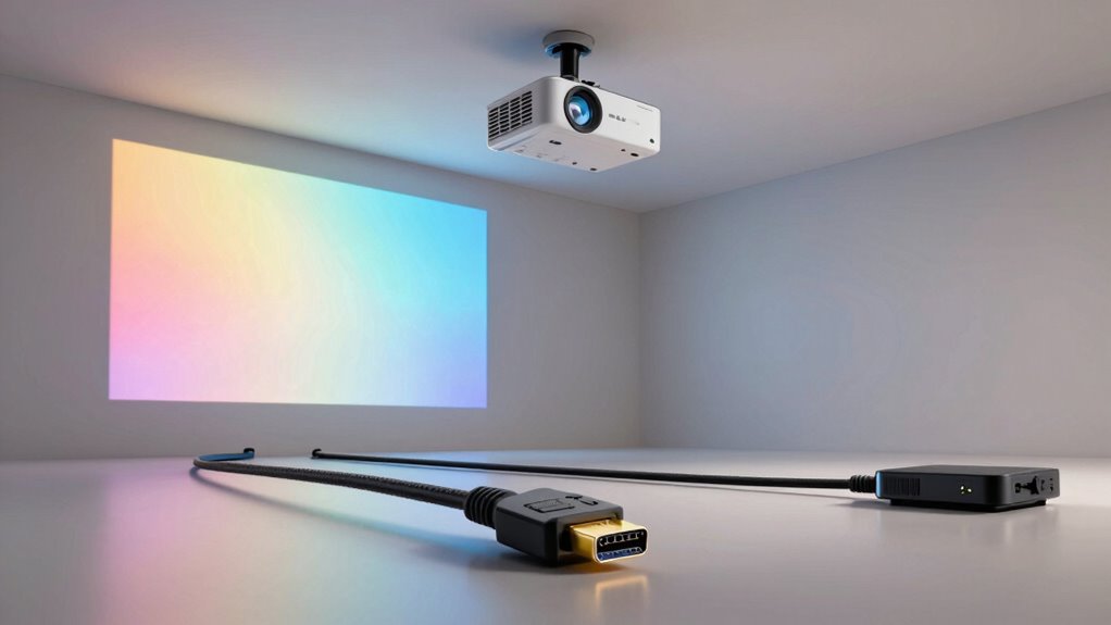 Choosing the right long HDMI solution for projectors over 50 feet hinges on installation flexibility, which is vital for maneuvering obstacles and fitting into various spaces. Fiber optic HDMI cables are particularly advantageous because they’re lightweight and thin, making it easier to route through walls or tight spots. Using cable management accessories and in-wall rated conduits helps maintain flexibility and prevents damage during installation. Directional HDMI cables require careful planning of source and display placement to guarantee reliable connection and ideal signal flow. Additionally, selecting cables with a proper bend radius is essential to avoid signal degradation and physical damage. Ultimately, flexible solutions allow for seamless installation, reducing time and effort while ensuring a clean, professional setup.