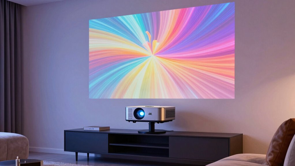 Ambient lighting considerably impacts a long throw 4K projector’s performance. For example, I once tested a projector in a brightly lit room; the image was washed out and lacked contrast. To get the best picture, I recommend controlling ambient light—using blackout curtains or dimming lights—especially in bright environments. This guarantees vibrant colors, sharp details, and an immersive viewing experience, even with long throw projectors.