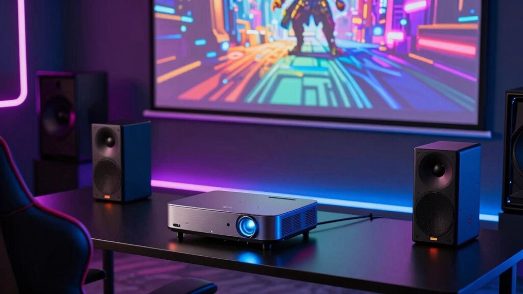 While diving into the world of gaming projectors, understanding audio latency is essential for an ideal experience. Audio latency is the delay between video and audio signals, and ideally, you want it below 20ms to keep your gameplay immersive. For fast-paced genres like first-person shooters, look for systems with latency of 4ms or less; timing is everything. Technologies like Dolby Atmos can enhance sound quality, but they might add latency, so it’s vital to find a balance. Check for low-latency modes designed for gaming to synchronize audio and visuals. Also, keep in mind that while wireless connections are convenient, they can increase latency. Opting for Bluetooth with low-latency support, like aptX Low Latency, can help.