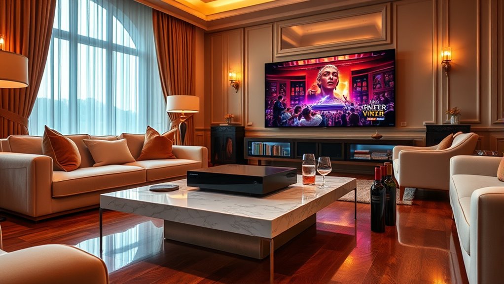 Choosing the right luxury 4K HDR box set often hinges on the genre and theme appeal, since these factors considerably influence your enjoyment and engagement with the content. Think about which genres excite you most—be it science fiction, action, or drama. A box set that aligns with your interests will keep you captivated. Look for collections featuring thematic arcs that resonate with you, enhancing the overall viewing experience. It’s also essential to check if the set includes extensive episodes and bonus features related to those themes. Don’t forget to read reviews that highlight storytelling quality and thematic depth. Lastly, guarantee the packaging reflects the genre’s tone, adding that luxurious touch to your collection.