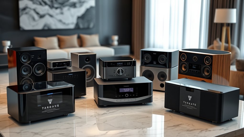 If you’re looking for the best luxury all-in-one sound systems that offer premium audio, I’ve got you covered. From sleek designs like Bang & Olufsen Beosound Emerge to powerful systems such as Proreck Club 3200, these options combine style, performance, and advanced connectivity. Whether for indoor ambiance or outdoor events, these systems deliver exceptional sound. Keep exploring to discover more details and find the perfect match for your space and needs.