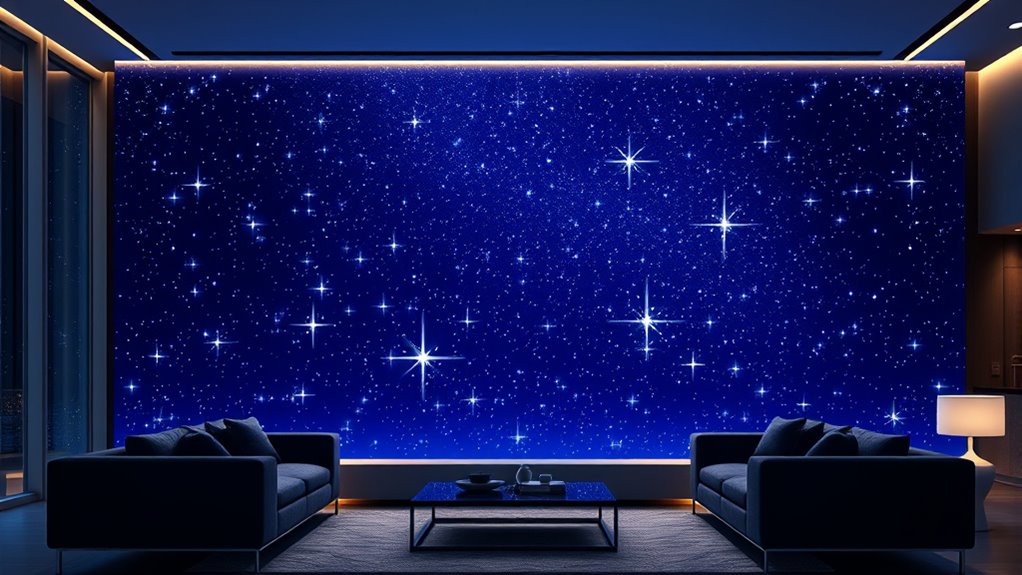 The design and aesthetic appeal of luxury fiber optic star panels play a crucial role in creating an immersive and visually stunning environment. I pay close attention to handcrafted fiber optic stars, secured by artisans to guarantee seamless illumination without loose strands or uneven lighting. Modern rectangular or galaxy-inspired patterns transform ceilings into mesmerizing celestial displays that instantly elevate any space. I also prioritize high-quality materials, such as fire-resistant, non-toxic, and fade-resistant components, which enhance durability and add a sophisticated look. Customizable lighting modes and colors allow me to tailor the ambiance to match different decor styles and moods. Additionally, these panels blend soundproofing with their starry effects, making environments both functional and breathtaking.