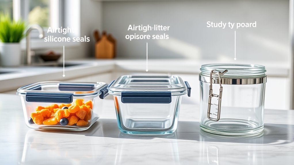 Selecting meal prep containers with thoughtful design and storage features can make a big difference in keeping your kitchen organized and meals fresh. I look for containers with secure, airtight lids to prevent leaks and maintain food quality during storage or transport. Stackable or nestable designs help maximize space in my fridge and pantry, making everything easier to access. Multi-compartment layouts are great for organizing different food items without mixing flavors. Clear, transparent glass allows me to identify contents instantly, saving time. Additionally, I prefer containers that are oven, microwave, and freezer safe, giving me flexibility to reheat and store meals conveniently. These features ensure my meal prep system is efficient, space-saving, and reliable, making my cooking routine smoother and more enjoyable.