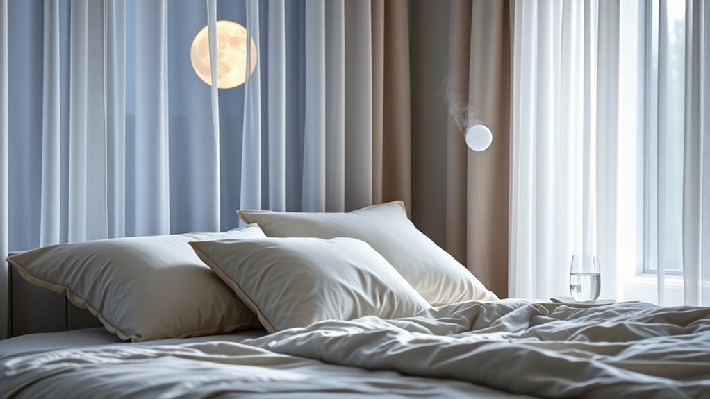 A quiet humidifier can make all the difference in creating a peaceful bedroom environment, especially when sleep is a priority. Typically, quiet models operate below 30dB, guaranteeing minimal disturbance. Ultrasonic humidifiers are especially popular for their whisper-quiet operation, using high-frequency vibrations to produce mist without noise. Keep in mind, noise levels can rise at higher mist settings, so adjustable controls are helpful to balance humidity needs with quietness. Many devices feature sleep or night modes that further reduce operational noise, creating a calm atmosphere during rest. To guarantee a peaceful experience, check the decibel ratings specified by the manufacturer. Choosing a humidifier with a low noise level allows you to enjoy a restful night while maintaining ideal humidity in your bedroom.