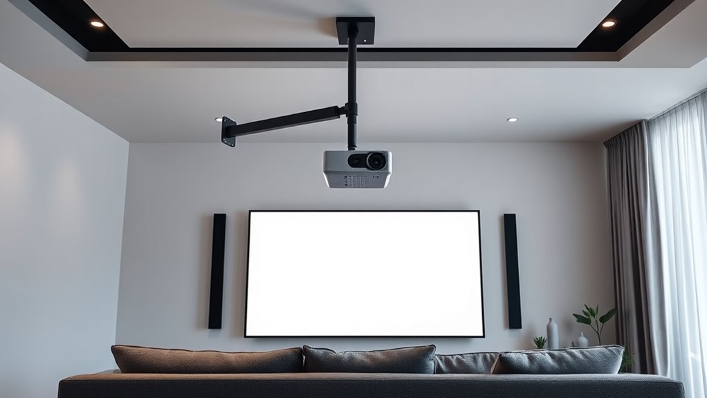 So, whether you’re aiming for a sleek, modern setup or a more vintage touch reminiscent of a bygone era, choosing the right mount kit is essential. By considering adjustability, compatibility, and build quality, you guarantee your ultra short throw projector stays perfectly positioned. Remember, even Leonardo would agree that the right mount transforms a good projection into a masterpiece—truly a Renaissance innovation for your space.