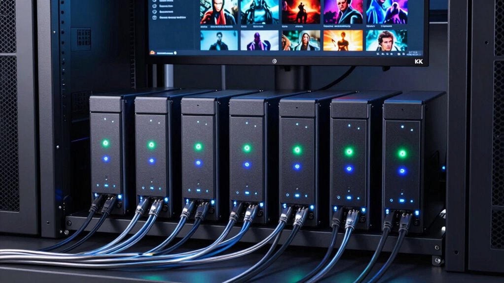 NAS devices handle multiple simultaneous 4K streams by leveraging powerful processors, ample RAM, and high-speed network interfaces like 10GbE. I’ve found that models with multiple LAN ports and hardware transcoding capabilities manage several streams smoothly without buffering. The key is choosing a NAS with enough processing power and bandwidth to support your number of devices. This way, everyone in my family can enjoy 4K movies at the same time without interruptions.