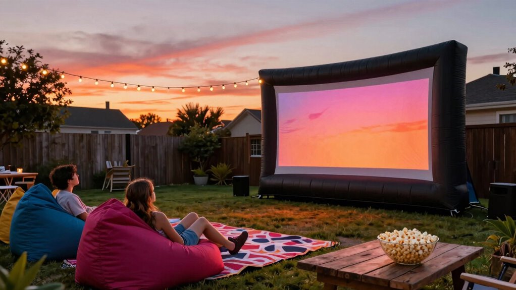 When you’re planning an outdoor movie night, setup time can make all the difference in your enjoyment. I’ve found that some inflatable projector screens can inflate in as little as 60 seconds, while others might take up to 3 minutes. Choosing a model with a high-power blower is key, as these often run quietly, making the experience more enjoyable. Look for designs that offer a one-piece setup; it really simplifies the process by eliminating complex assembly. Plus, proper storage solutions like carrying bags can make transport and setup a breeze. Efficient setup not only saves time but also lets you dive straight into the movie, maximizing your outdoor fun!