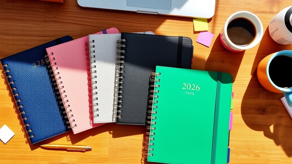 When selecting a planner for 2026, durability and material quality play a vital role in ensuring it lasts all year long. I look for planners with hardcover or reinforced covers to withstand daily use and prevent damage. High-quality paper, like 100gsm bleed-resistant stock, not only lasts longer but also resists tearing and fraying, keeping my notes intact. Laminated tabs and spiral bindings add structural strength, ensuring the planner stays intact even with frequent flipping. I also appreciate flexible cover materials, such as faux leather or laminated covers, which resist water and stains, making the planner more resilient. Choosing eco-friendly, FSC-certified materials aligns with sustainability goals without sacrificing durability, giving me peace of mind that my planner is both long-lasting and environmentally responsible.