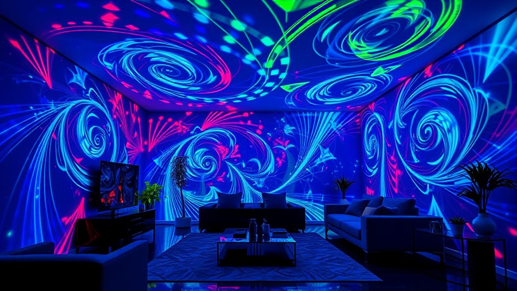 Portable laser mapping projectors are surprisingly effective outdoors and in bright settings, especially when they have high lumens and powerful lasers. I’ve found that the latest models use advanced optics and brightness levels to cut through ambient light, making images clear and vibrant. While they perform well, I recommend choosing a projector with high brightness ratings and adjustable settings to guarantee ideal visibility in challenging lighting conditions.