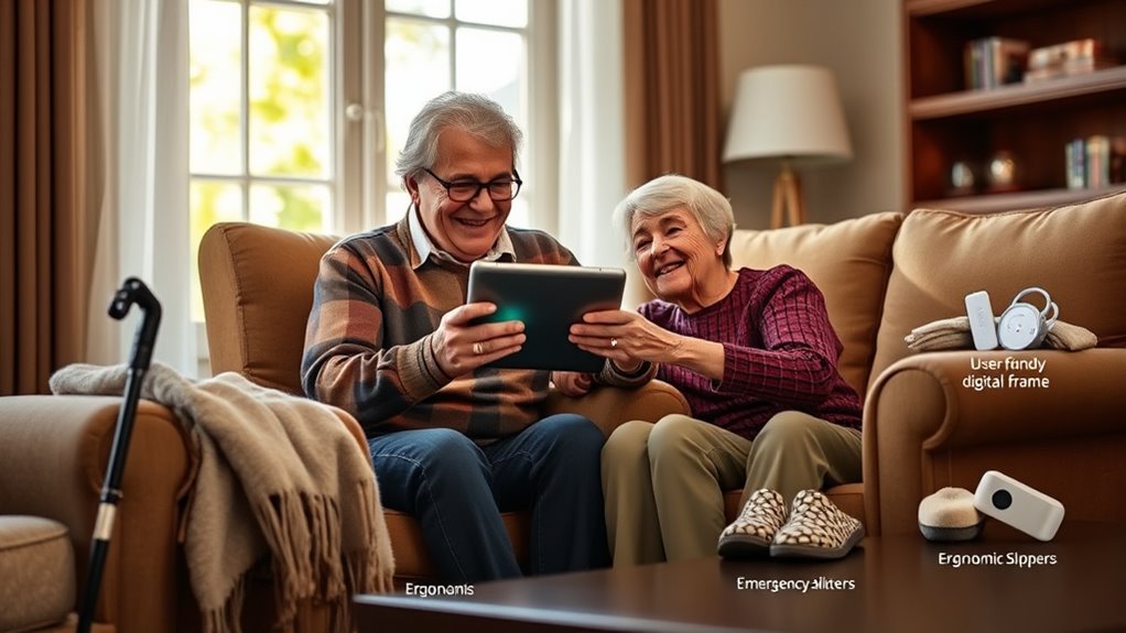 Safety features play a vital role in guaranteeing that practical gifts for elderly parents are not only useful but also secure. I always check for non-slip bases or grips on items like kitchen tools or rugs to prevent slips on smooth surfaces. It is important to choose products with safety certifications or compliance labels, confirming they meet safety standards. I favor devices with automatic shut-off functions to avoid overheating or electrical issues. Additionally, I look for designs with minimal sharp edges or small parts that could cause injuries or choking hazards. For electronic gifts, I make sure they come with clear instructions and simple controls, making them easy and safe for elderly users. Prioritizing these features helps me give gifts that truly care for their safety and well-being.