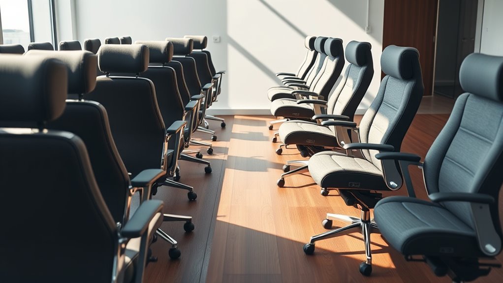 Choosing a premium adjustable armrest seat means prioritizing comfort and ergonomics, especially during long hours of sitting. An ergonomic armrest supports my arms in their natural position, reducing strain on my shoulders and neck. I love the adjustable features—height, angle, and rotation—because they let me customize the armrest for ideal comfort, ranging from 0° to 120°. Proper padding, like high-density foam or PU sponge, is essential for soft support, helping to alleviate pressure points. I also appreciate a well-designed armrest that maintains stable contact with my arm, minimizing fatigue. Ultimately, I consider the material’s breathability and durability, ensuring that my comfort remains consistent even after frequent adjustments.