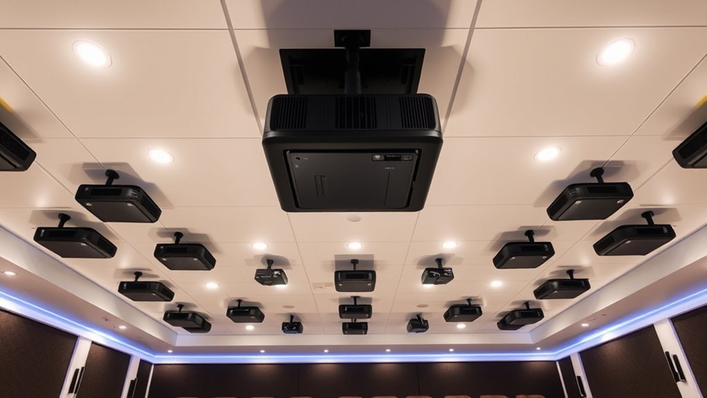 I make sure to hide cables inside the mount’s arm or use cable raceways painted to match the ceiling. I run wires neatly along the mount’s structure, securing them with clips or zip ties to prevent sagging or tangling. Visualize a sleek, invisible highway for cables—this keeps everything tidy and safe, blending seamlessly into your ceiling for that flawless home theater look you desire.