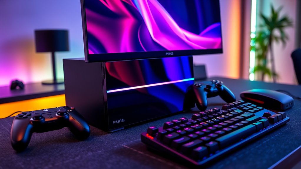 High-quality graphics and vibrant displays considerably elevate the gaming experience, making visuals more immersive and realistic. Opting for 4K or 1440p resolution guarantees sharper images and enhances detail, drawing you deeper into the game world. A refresh rate of 120Hz or higher provides smoother motion, which is especially important during fast-paced action, reducing motion blur and lag. Graphics quality settings, including textures, shadows, and anti-aliasing, directly impact realism and visual fidelity, so choosing bundles with powerful graphics cards and ample VRAM—8GB or more—ensures high performance even in demanding titles. Features like HDR support and wide color gamuts further improve contrast, color accuracy, and depth, creating visuals that are richer, more vibrant, and truly lifelike.