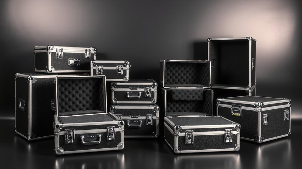 Choosing a premium heavy-duty projector case means considering the material durability and quality, as these factors are essential for protecting your equipment. I always look for cases made from impact-resistant materials like high-grade polypropylene or reinforced nylon. These materials guarantee the case can withstand harsh conditions. Additionally, I find that features like weatherproof coatings and reinforced corners are indispensable for preventing damage from drops and environmental elements. It’s also smart to choose cases with abrasion-resistant and waterproof properties to extend their lifespan. Lastly, certifications like MIL-STD or IP ratings give me confidence in the durability and protective capabilities of the case, ensuring my projector and accessories stay safe no matter where I go.