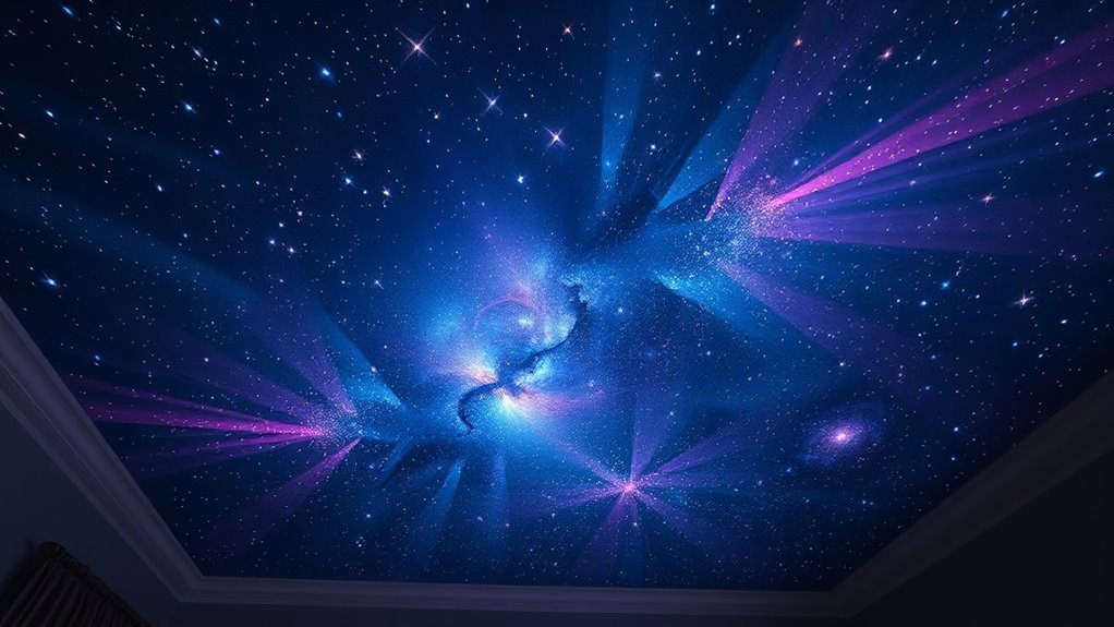 Ease of use is essential for enjoying premium laser starfield ceiling lights, as nobody wants to struggle with complicated setups or controls. I always look for user-friendly features like remote controls or app integration that simplify operation. Clear and intuitive instructions are a must; they save me time and hassle. Automated features like timers and shutoff functions are great for convenience, letting me enjoy the stars without constant adjustments. I appreciate having adjustable focus, rotation speed, and light intensity easily accessible, so I can customize my experience effortlessly. Additionally, compatibility with voice commands or smartphone apps is a real bonus, especially for those of us who might have mobility or dexterity challenges. It makes transforming my space even more enjoyable!