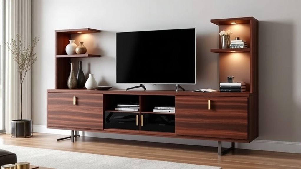 Selecting media furniture with versatile storage options means considering how adjustable shelves, cabinets, drawers, and specialized compartments can adapt to my devices and accessories. Adjustable shelves let me customize space for different-sized electronics, while closed cabinets and open shelves provide flexible organization for entertainment gear and decor. Drawers help keep remotes, cables, and small accessories out of sight, maintaining a clean look. Some units feature hidden compartments or specialized sections to conceal clutter and streamline the appearance. Modular designs allow me to rearrange components to fit various room layouts or changing needs. Enhanced storage features, like cable management systems, built-in power outlets, or LED lighting, add convenience and style, making the furniture both functional and visually appealing.