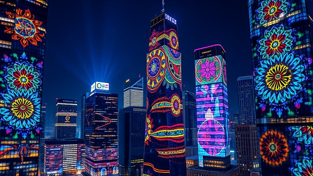 Advanced lighting features can elevate projection mapping from simple images to immersive experiences. I look for projectors with multi-zone RGBW or RGBY LED systems, which allow precise color mixing and dynamic effects. High-brightness laser or LED sources with over 10,000 lumens ensure vivid visuals even in brightly lit environments. Integrated software algorithms enable real-time light modulation, like pulse, fade, strobe, and color chase effects, often synchronized with audio or visuals. Some models offer customizable geometric correction and blending, making multi-projector setups seamless and complex. Adjustable beam angles, focus, and intensity controls are essential for creating multi-dimensional, immersive displays. These advanced lighting features are key to transforming ordinary projections into captivating, professional-grade visual experiences.