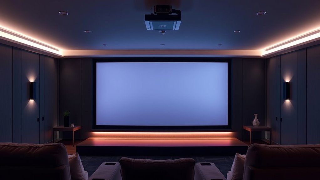 Maintaining high-end rear projection screens is straightforward but essential for peak performance. I regularly dust the surface with a soft cloth to prevent dirt buildup, avoiding harsh chemicals. I also keep the environment clean and humidity-controlled to prevent warping or damage. Periodic inspections ensure no scratches or damage occur, and I follow the manufacturer’s guidelines for cleaning and care. Proper maintenance keeps my screen vibrant and clear for years to come.