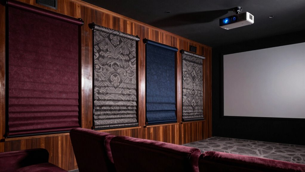 - Choose blackout options like Blackout Zebra Blinds or Roller Shades for complete light blockage essential in theaters.