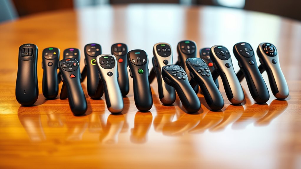 Imagine commanding your presentation with the flick of a wrist, no matter where you stand in the room. Different clicker ranges expand your freedom—short-range models keep you close, ideal for small rooms, while long-range options let you roam freely, perfect for large auditoriums. I’ve found that choosing the right range boosts your confidence and makes your delivery seamless, ensuring your message hits home every time.