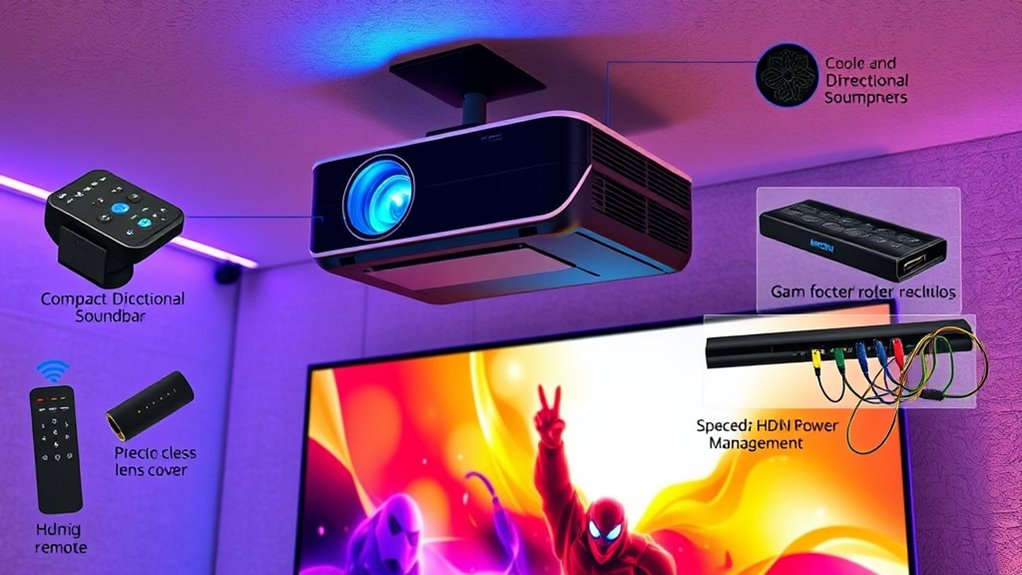 Choosing projector accessories with additional features can considerably enhance your gaming experience by offering greater flexibility and convenience. Adjustable angles, rotation capabilities, and quick-lock mechanisms make setup easier and allow you to customize your projection for ideal viewing. Built-in cooling fans and noise reduction technology help keep the projector running smoothly during long gaming sessions, preventing overheating and minimizing distractions. Integrated cable management systems keep your setup tidy and safe, reducing clutter and potential hazards. Compatibility with various devices like smartphones, tablets, and gaming consoles broadens your options and simplifies connections. Features such as remote controls, app connectivity, and programmable settings enable effortless customization, giving you full control over your gaming environment. These functions make your setup more efficient, versatile, and enjoyable.