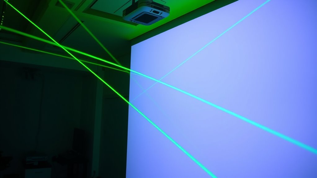 Brightness and visibility play a vital role in selecting the right projector alignment laser, especially when working in different lighting conditions. Higher brightness levels, like Level 4 or 5, guarantee the laser line remains clear and visible even in well-lit or outdoor environments. Most laser alignment tools have output power under 5mW (Class IIIr), making them safe while still providing sufficient brightness. The emission wavelength, usually in red or green, also influences visibility—green lasers tend to be more visible in various lighting conditions. Adjustable brightness levels are a practical feature, allowing me to optimize visibility based on ambient light and workspace needs. Ultimately, choosing a laser with appropriate brightness ensures precise alignment without straining your eyes or losing sight of the laser line.