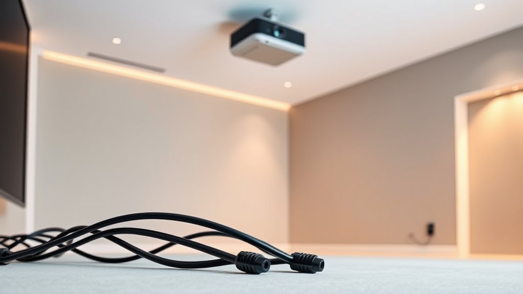 If you’re aiming to keep your projector setup neat and free of tangled cables in 2025, I recommend exploring a variety of cable management options. From slim wall cord covers, like Delamu’s 128-inch organizer, to flexible raceway systems and secure connectors, there’s a solution for every space. Choosing durable, paintable, and easy-to-install tracks will hide your cables seamlessly. If you want to discover the best options tailored for your setup, keep exploring—there’s plenty more to learn.