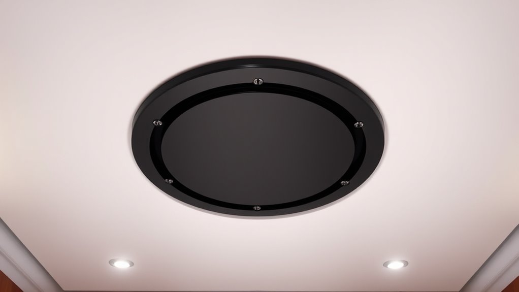 Price and warranty are key factors to weigh when selecting a projector ceiling plate. I recommend comparing prices across multiple sellers to guarantee you get a competitive deal. Don’t forget to check if the product includes a warranty or satisfaction guarantee, which protects your investment. Pay attention to the warranty duration and what it covers, such as defects or damages during installation. Opt for ceiling plates with documented warranty support and accessible customer service—this makes handling any issues much easier. If you find a lower price elsewhere or encounter a faulty product, warranty claims and feedback channels can help you report problems and seek resolution. Prioritizing these factors ensures you choose a reliable, cost-effective product that offers peace of mind.
