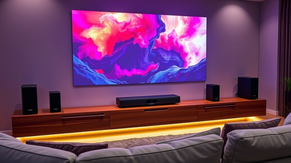Achieving clear sound quality from a projector-compatible system hinges on selecting the right components and settings. A high signal-to-noise ratio, ideally above 80 dB, minimizes background noise and distortion, ensuring pure audio. Look for systems with dedicated tweeters and woofers, which improve the separation of high and low frequencies, resulting in more precise sound. Support for advanced formats like Dolby Atmos and DTS:X enhances spatial clarity, making audio more immersive. The frequency response range, from 20Hz to 20kHz, determines how well the system reproduces deep bass and crisp treble. Finally, properly calibrated equalizer settings can balance frequencies, reducing muddiness or harshness. Together, these factors ensure your projector delivers the clearest, most accurate sound possible.