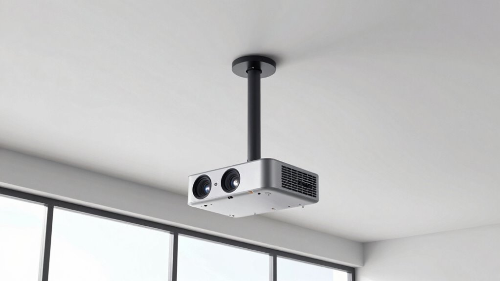 When selecting a projector drop pole mount for high ceilings, the mounting style plays a significant role in guaranteeing a secure and functional setup. Different styles, such as ceiling flush mounts, telescoping arms, and wall-mount configurations, cater to various room layouts and aesthetic preferences. Adjustable extension lengths, typically between 13 to 26 inches, help accommodate different ceiling heights. Some mounts include tilt and swivel functions, allowing for precise projector positioning after installation. The chosen style impacts not only ease of installation but also cable management and visual integration with the environment. Additionally, compatibility with different ceiling types—flat, sloped, or suspended—is essential to achieve a stable, secure fit. Selecting the right style ensures peak performance and minimal hassle.