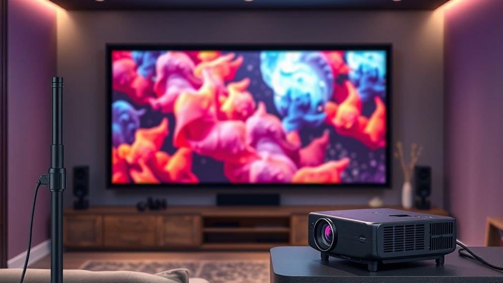 In choosing the perfect projector extension pole, I focus on flexibility, durability, and ease of installation. I look for adjustable height, sturdy construction, and compatibility with my setup. I prioritize convenience, reliability, and versatility, knowing each factor enhances my viewing experience. By considering these qualities, I guarantee my projection setup is seamless, secure, and tailored to my needs. Ultimately, selecting the right pole transforms my space into a perfect home theater or presentation area.