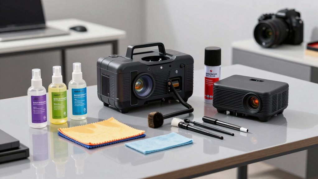 If you’re looking for the 14 best projector maintenance kits for 2026, I’ve got you covered. These kits include everything from cleaning tools, lens cleaners, and blower brushes to repair parts for vintage projectors. They’re designed to keep your device performing at its peak, extending its lifespan and ensuring ideal picture quality. Plus, they’re portable, durable, and easy to use. Keep going to discover all the options that can help you maintain your projector effortlessly.