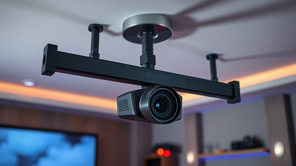Space-saving projector mount accessories are essential for maintaining a clutter-free environment while still providing ideal viewing angles. I look for mounts with foldable or retractable features that reduce clutter when not in use. Compact solutions like mini ceiling or wall brackets help maximize room flexibility without sacrificing stability. Adjustable extension arms are vital for precise positioning while keeping the overall setup footprint small. I also prioritize mounts with integrated cable management systems to hide wires and keep the space tidy. Multi-purpose mounts that support wall, ceiling, or corner installations offer versatile options, optimizing space in different environments. These design features ensure my setup remains unobtrusive, functional, and adaptable, making my viewing experience more comfortable and space-efficient.
