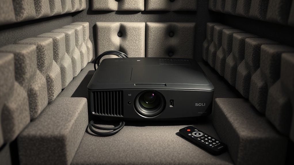 If you’re looking to keep your projector’s noise quiet and your view clear, I recommend checking out a variety of noise dampening solutions like acoustic foam panels, curved foam designs, and vent noise kits. These products help absorb sound, reduce vibrations, and minimize airflow noise, creating a better viewing experience. From small acoustic panels to all-inclusive dampening kits, there’s something for every space. Stick around to discover the top options that can improve your setup effortlessly.