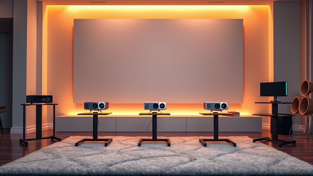 A stable projector stand is essential for a smooth viewing experience, and it relies heavily on a wide, heavy-duty base or tripod that prevents tipping during use. Supports should feature secure locking mechanisms for height and angle adjustments, ensuring the stand stays put once you’ve set it. Materials like steel or reinforced aluminum boost support strength, minimizing wobbling and vibrations that can distort your image. Extra stability can come from non-slip pads, rubber feet, or weighted bases, which keep the stand firmly in place on various surfaces. Proper setup is vital—make sure the legs are evenly positioned and adjustable joints are tightly secured. When these factors are prioritized, your projector remains steady, providing a clear, seamless movie night every time.