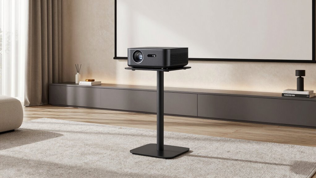 Ever wondered how to keep your living room setup flexible and clutter-free? Portable projector stands are a game-changer. They’re lightweight and foldable, making transportation and storage effortless. Compact designs with collapsible features help save space when the projector isn’t in use or during temporary storage. Many portable stands come with carrying bags or cases, so you can quickly set up or pack away your equipment for different viewing sessions. Adjustable height and tilt options allow you to customize the projector’s position without bulky gear, enhancing convenience. Easy-to-store stands can be tucked away in closets or under furniture, maintaining a tidy living space. This flexibility guarantees your setup adapts seamlessly to your needs without sacrificing style or functionality.