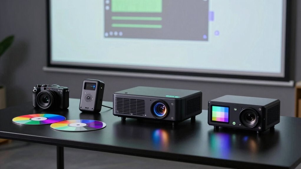 Ever wondered how to guarantee your testing tools match the projectors you’re working with? First, check if the tool supports the specific projector type—DLP, LCD, or LED—since each has unique requirements. Make sure it supports the connector types used, like HDMI, VGA, DisplayPort, or composite inputs, to ensure compatibility during setup. Also, verify that the device can handle the projector’s voltage and current needs for both power and signals. Compatibility with the projector’s resolution and image quality features is vital for accurate testing results. Lastly, confirm the testing equipment integrates smoothly with other installation components and adheres to the projector’s compatibility standards. This guarantees reliable performance and reduces installation hiccups.