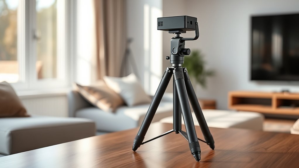 Adjusting the tripod height during use is like turning a dial on a musical instrument—smooth and straightforward. Most modern tripods feature quick-release levers or twist locks that let me change the height effortlessly, even mid-presentation. This ease of adjustment guarantees I can fine-tune my projector’s position on the fly, keeping the viewing experience crisp and stable without missing a beat.